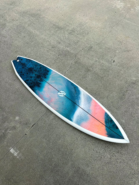 5'6" x 18.25" x 2.18" Bliss Model twin fin with custom resin pigment by shaper & designer Matt Parker and "Alma" resin art by Zee.